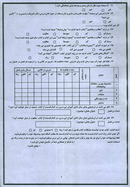از سوی دبیرخانه راهبری کشوری درس ریاضی، فرمی برای نقد و بررسی کتاب حسابان طراحی شدهاست. این فرم با جزئی تغییر در زیر میآید.